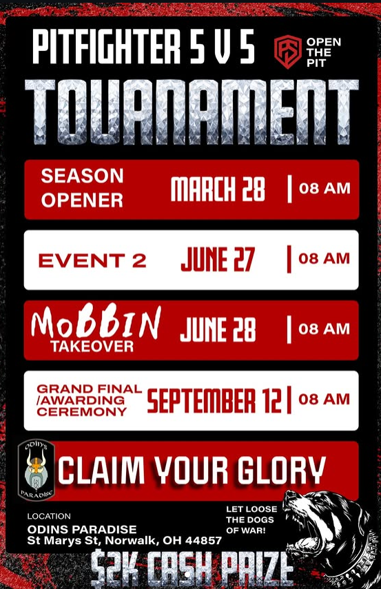 - Team Entry: $200 - this can be be paid in person at Odin’s Paradise, or via the associated Pitfighter 5v5 shopify page linked at the bottom of this page. Preregistration is preferred, but day of registration will be available.